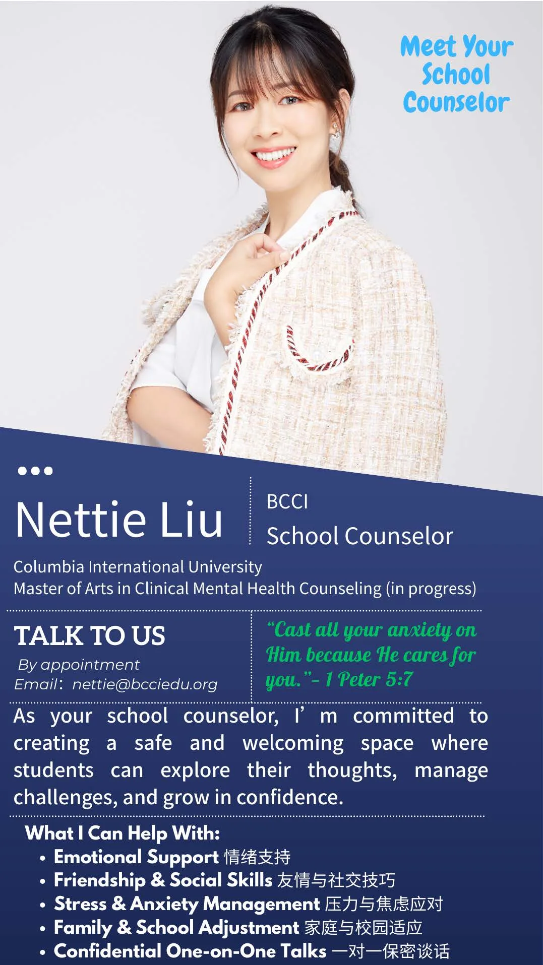 中文:Ms. Nettie Liu 担任 BCCI 的学校心理咨询师。她目前在美国哥伦比亚国际大学(Columbia International University)攻读临床心理健康咨询硕士学位,接受将循证咨询方法与基督教世界观结合的专业培训。